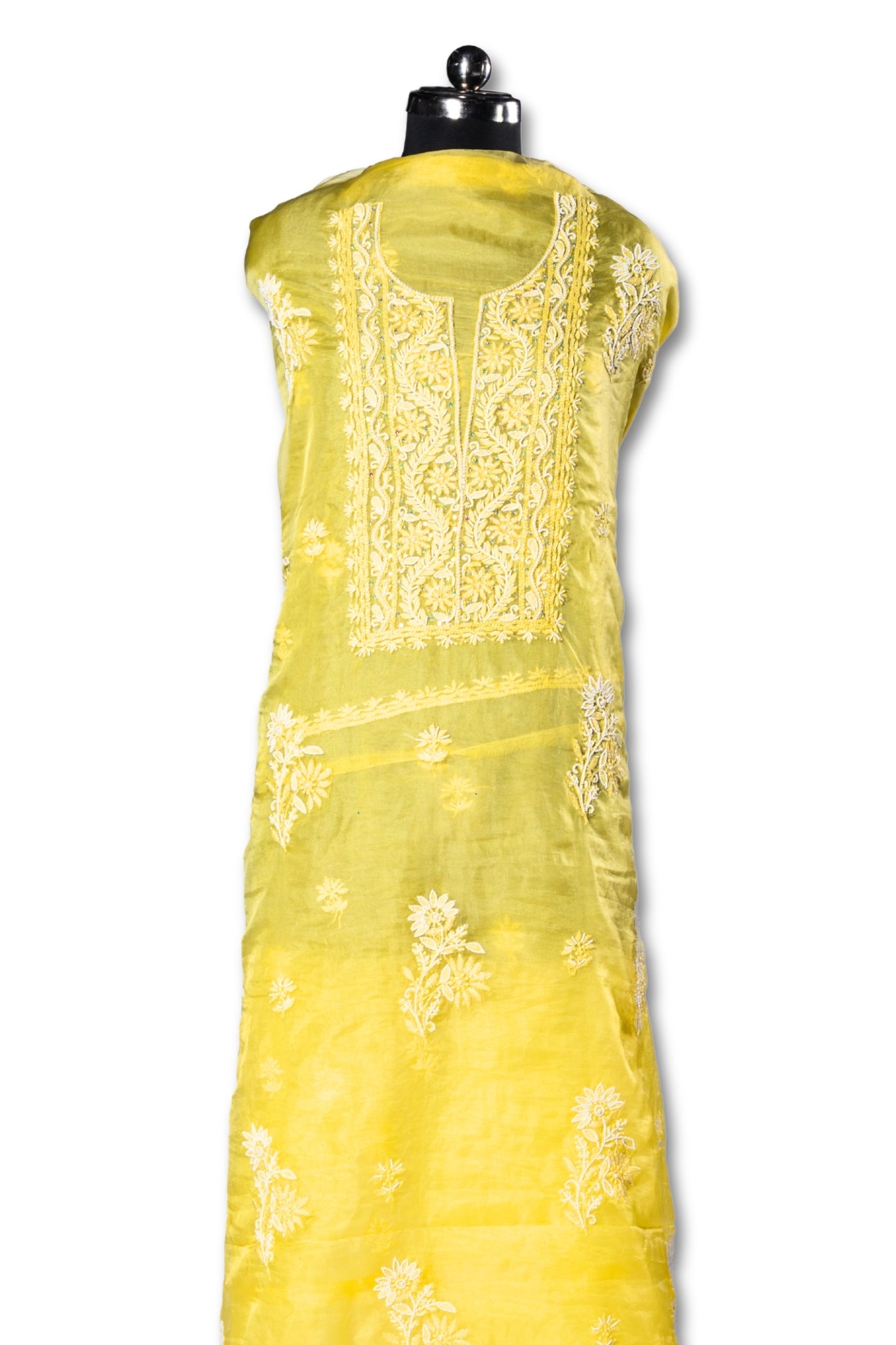 Organza Chikankari Suit with Cutdana Moti Work(4 Piece, Unstitched, Yellow)