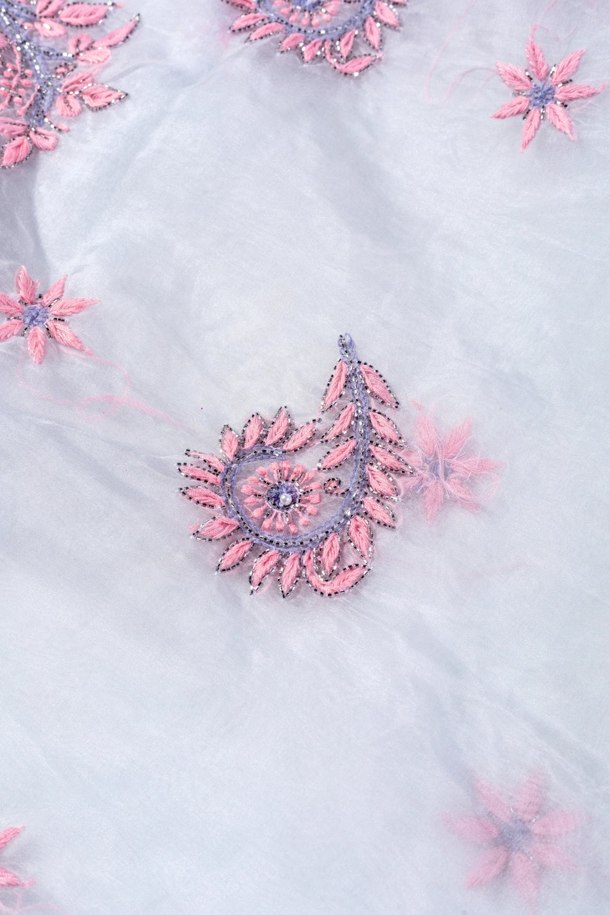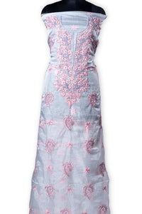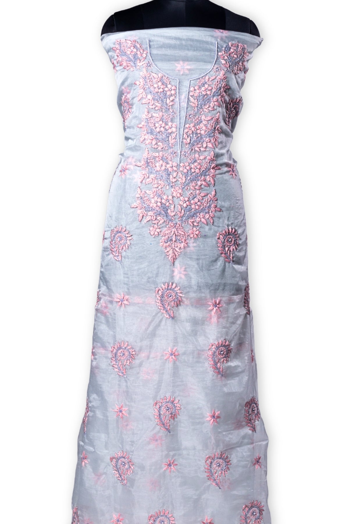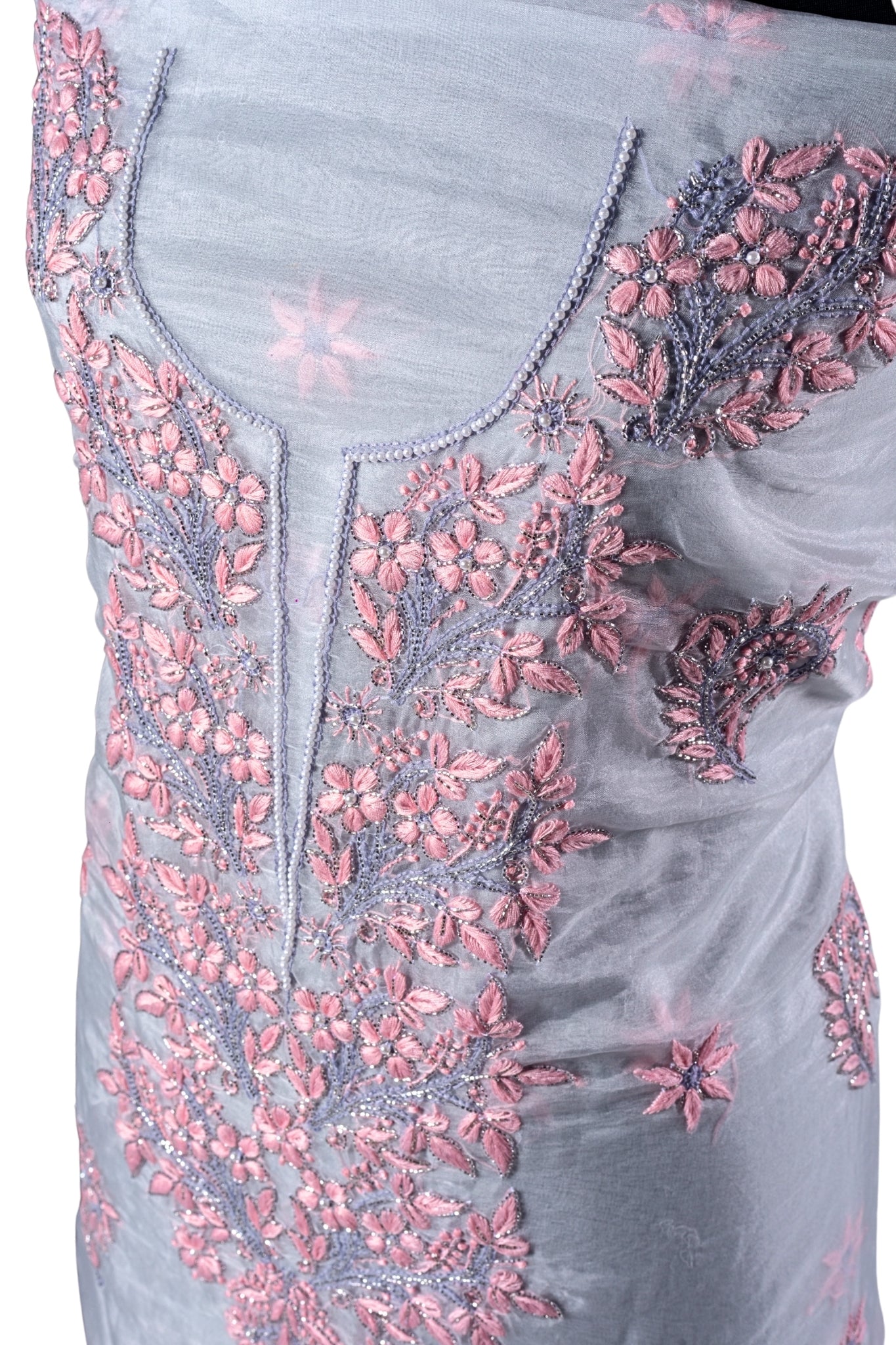 Crafted from premium organza, this light grey four-piece unstitched suit features intricate chikankari embroidery enhanced with delicate cutdana and moti embellishments. The breathable fabric and detailed handiwork combine to offer a refined, elegant ensemble perfect for bespoke tailoring and formal occasions, showcasing a harmonious blend of traditional craftsmanship and contemporary design.