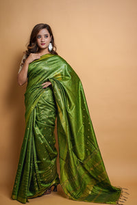 Embrace bold tradition with this striking Bengali Handloom Tussar Silk Saree in vibrant green. Handwoven by expert artisans, its rich tussar silk texture shines with natural lustre, while daring golden motifs and a finely detailed border command attention. The minimalist golden squares scattered across the fabric add a modern edge to classic elegance. Perfect for making a statement at festivals or formal events, this saree fuses Bengal’s heritage with fearless style. Step into this masterpiece and own every room you enter.