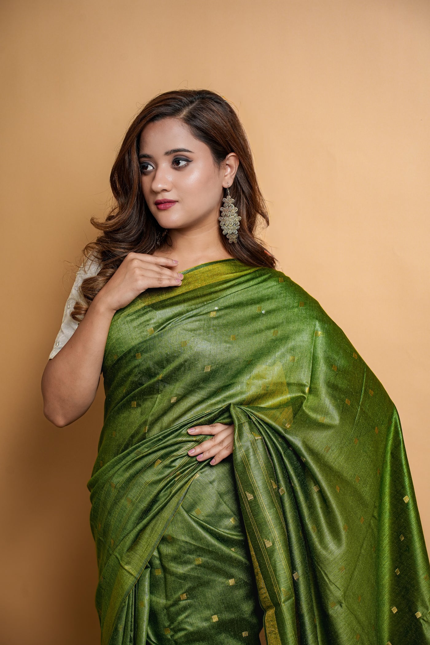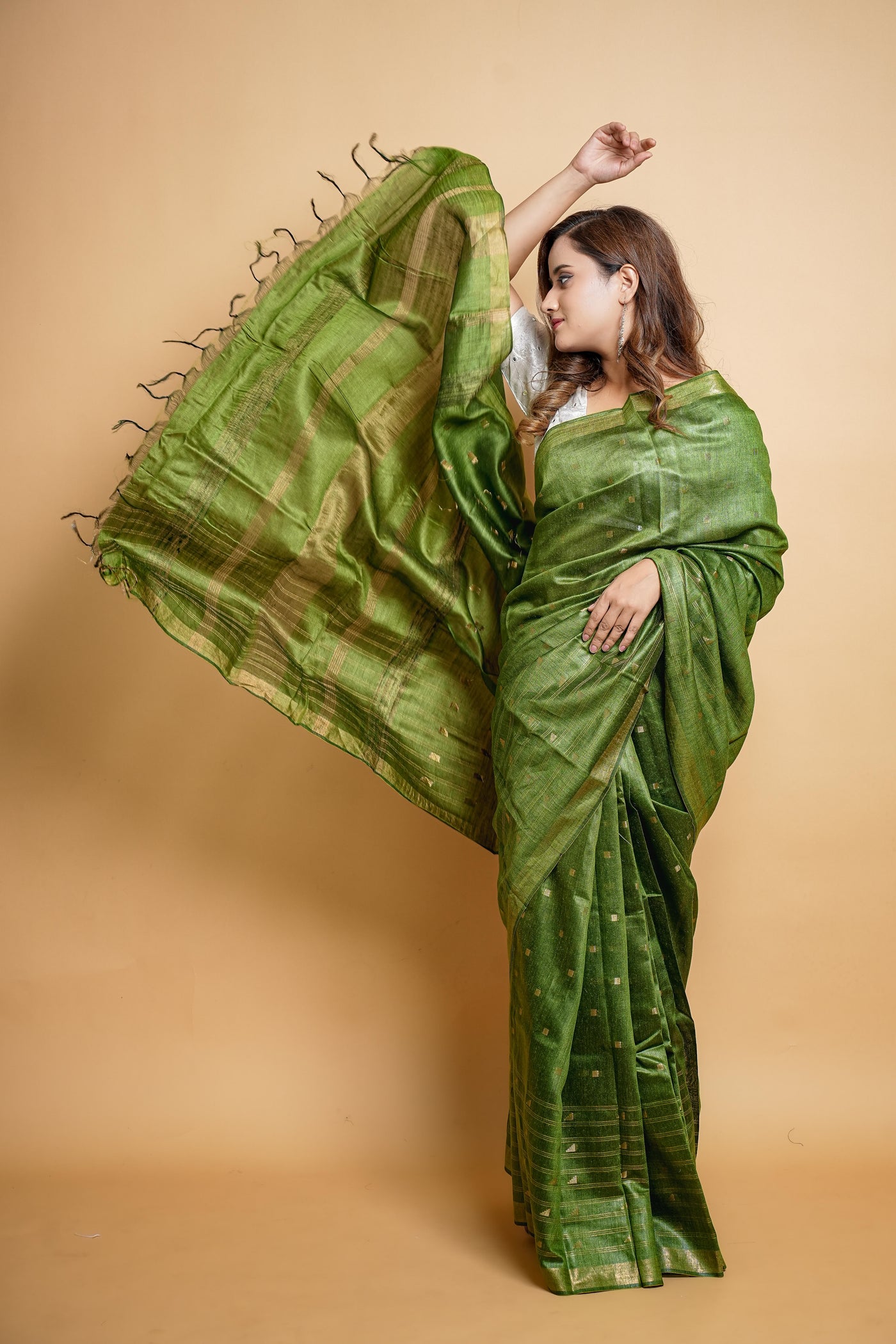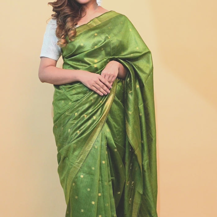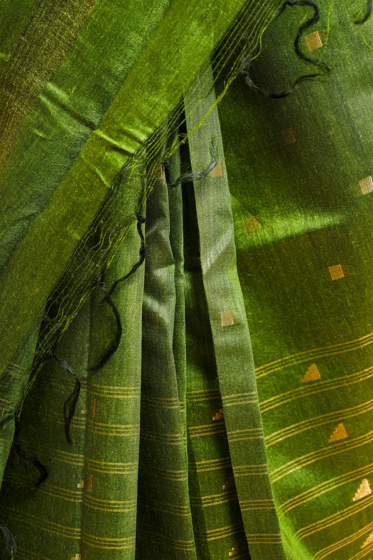 #TussarSilk #HandloomSaree #BengaliWeaves #GreenSaree #TraditionalElegance #IndianTextiles #EthnicWear #FestiveFashion
