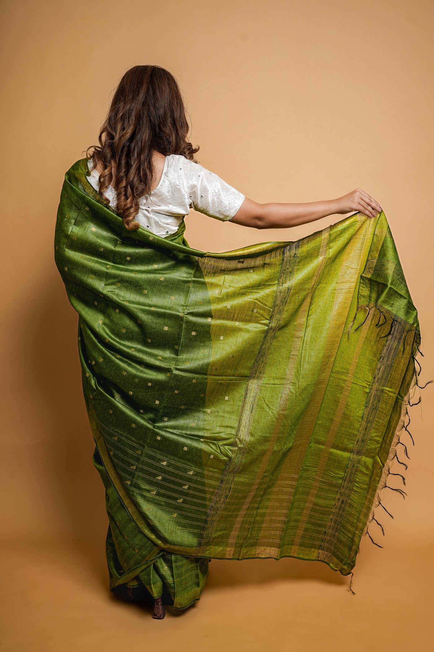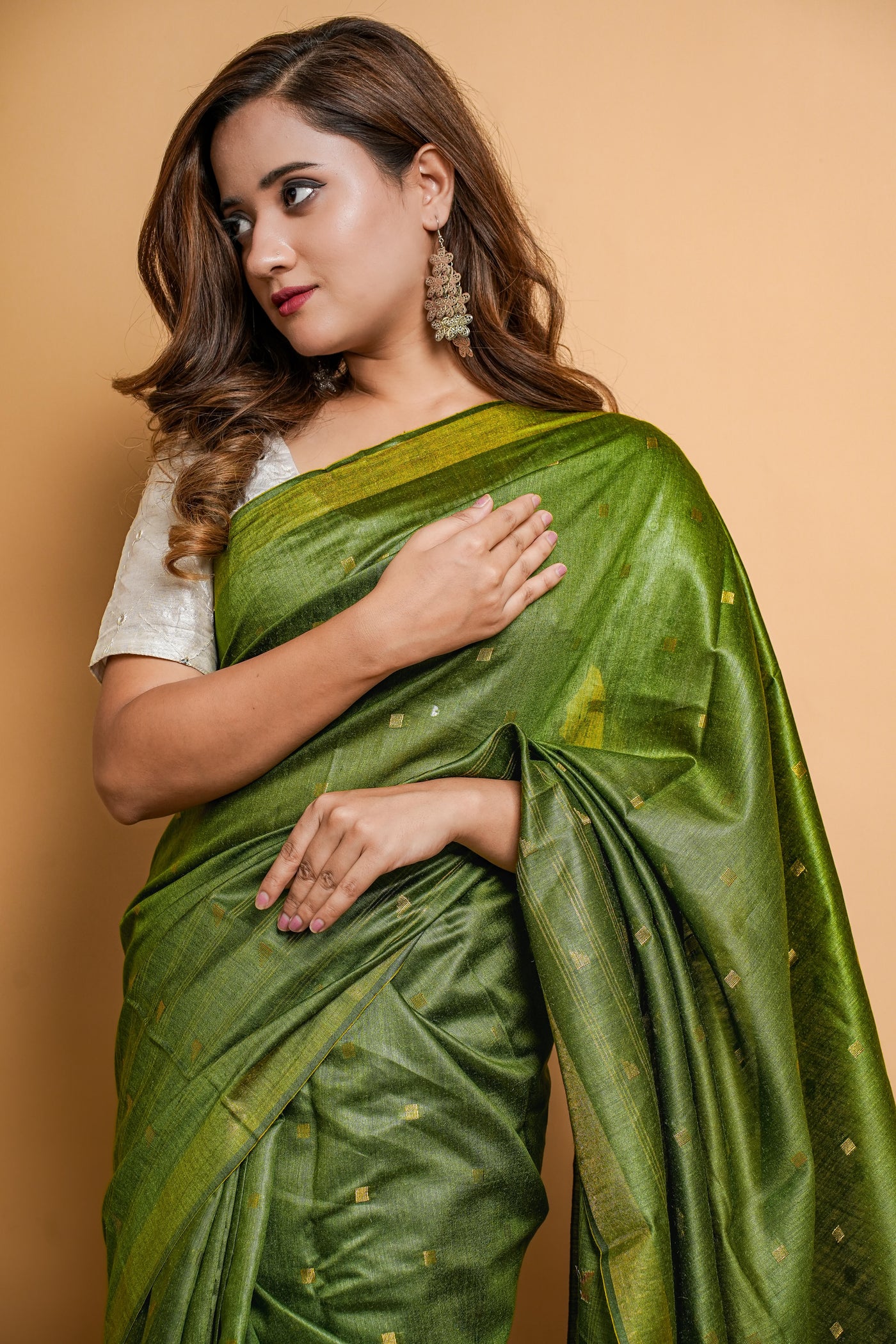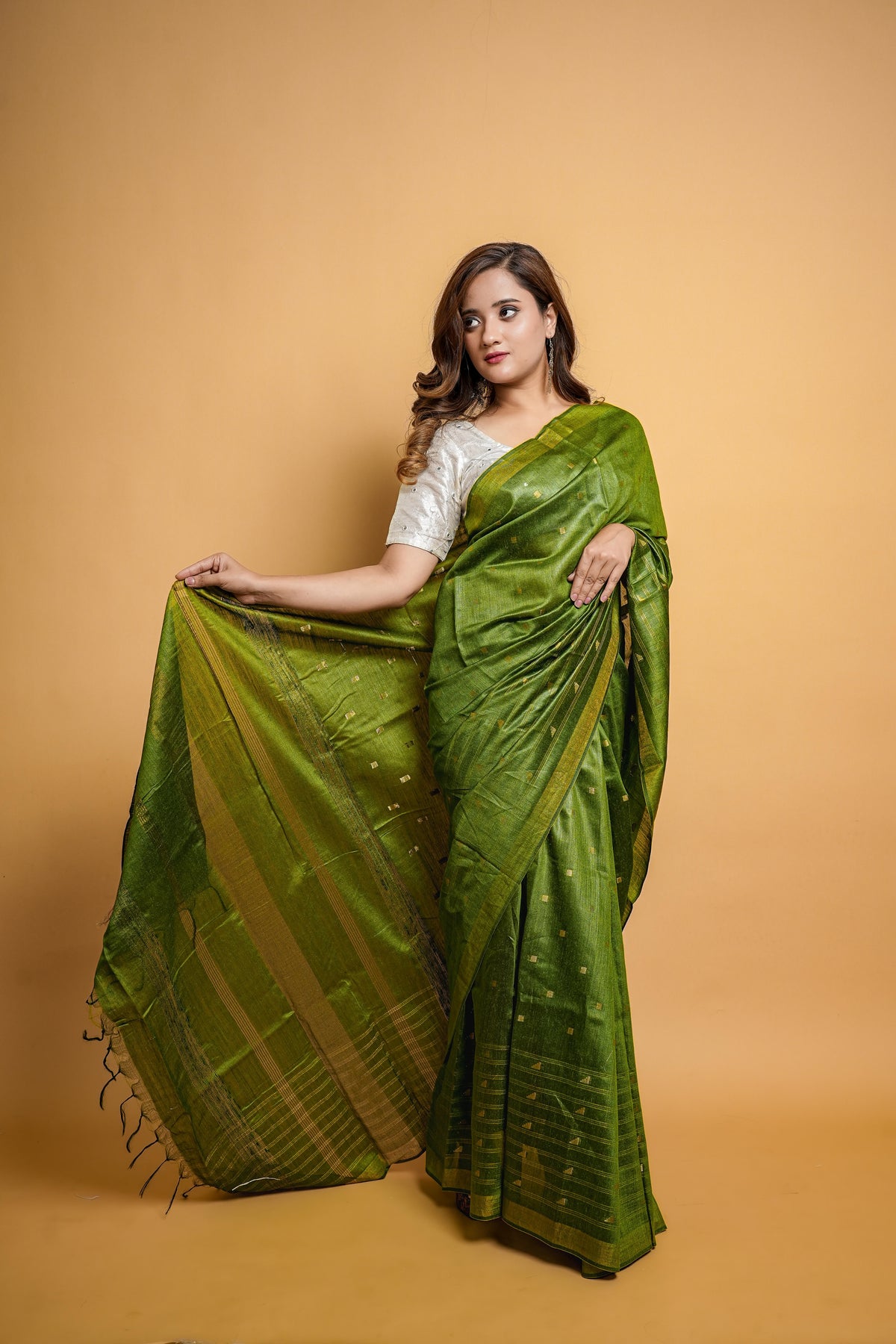 #TussarSilk #HandloomSaree #BengaliWeaves #GreenSaree #TraditionalElegance #IndianTextiles #EthnicWear #FestiveFashion