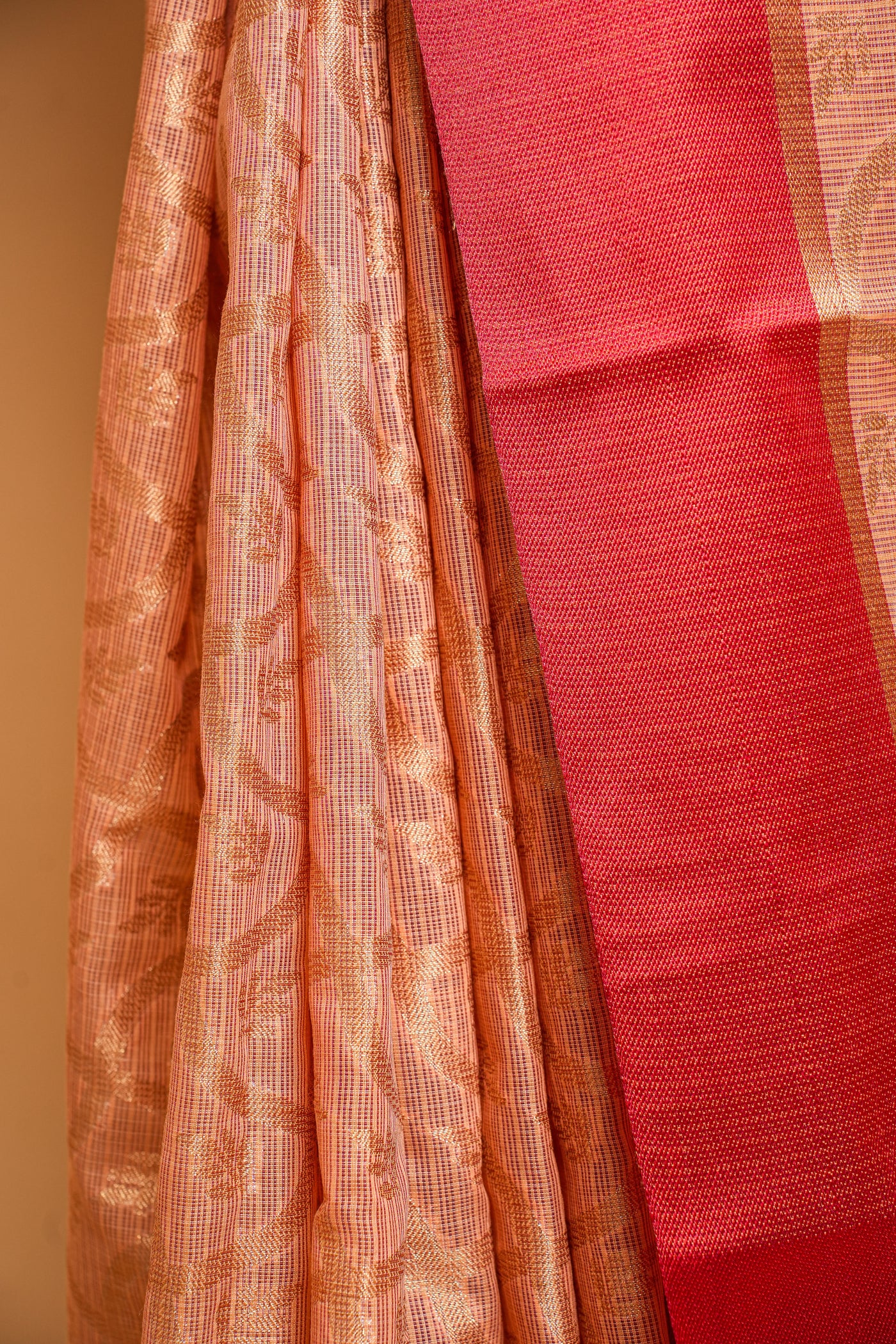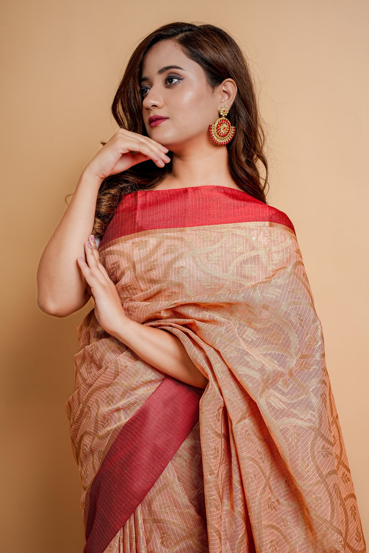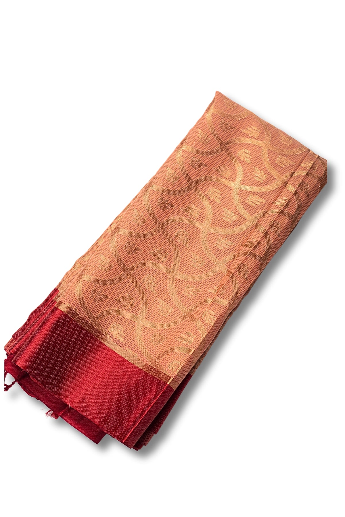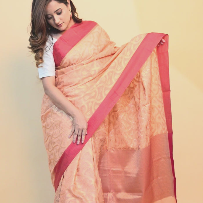 Celebrate breezy elegance with our Peach Banarasi Kota Saree, a charming confluence of comfort and craft. Crafted in the airy, lightweight Kota weave, this saree features a delicate peach body adorned with soft golden motifs arranged in a lattice-like vine pattern — a symbol of understated luxury. The golden zari detailing is complemented beautifully by a striking contrast red border that adds depth and traditional appeal to the piece. Ideal for summer festivities, pujas, or intimate gatherings, this saree effortlessly blends grace with wearability. Its semi-sheer texture and refined shimmer make it a versatile choice for women who appreciate finesse without the fuss.