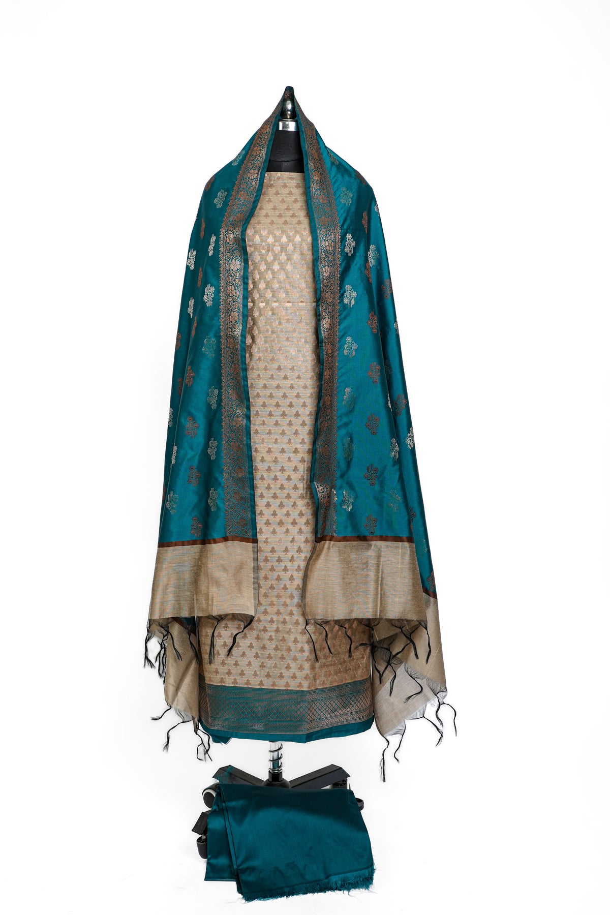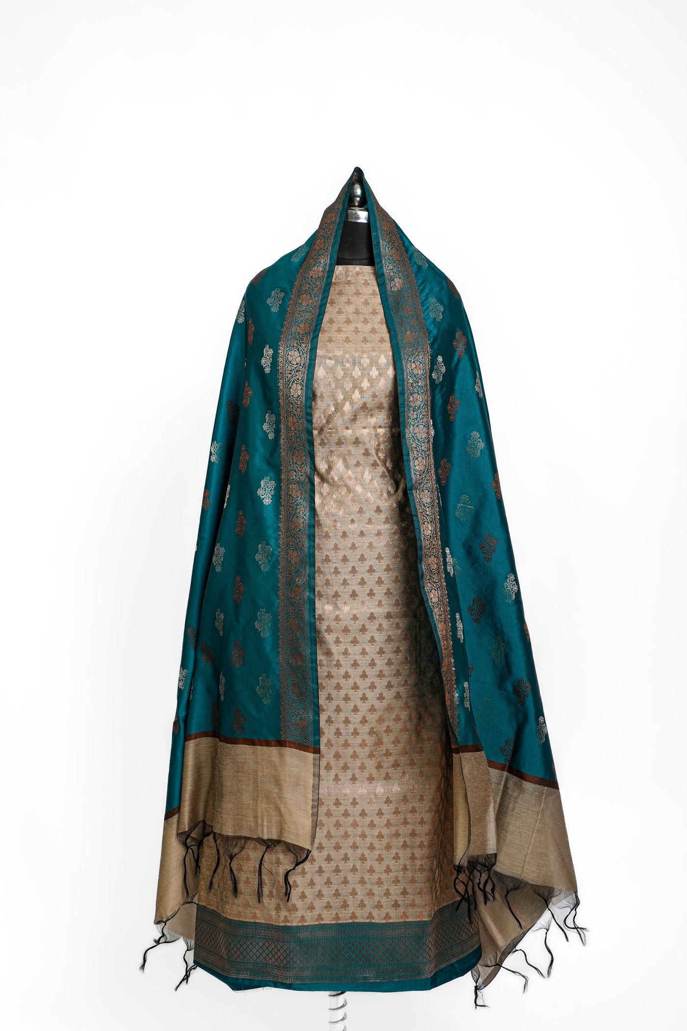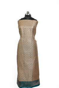 This Banarasi Silk Suit in a stunning beige and deep teal green combination brings together tradition and elegance in a truly timeless manner. A 3-piece unstitched ensemble, it features a rich silk fabric base adorned with intricate golden zari motifs throughout the dupatta and kurta material. The deep green color is contrasted beautifully by a luxurious beige dupatta showcasing classic Banarasi patterns, including floral bootis and lattice work. The fabric drapes gracefully, ideal for festive wear, weddings, or cultural events, offering the wearer a regal yet refined presence. It’s an ideal pick for someone who values heritage handloom craftsmanship combined with modern color sensibilities.