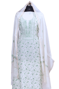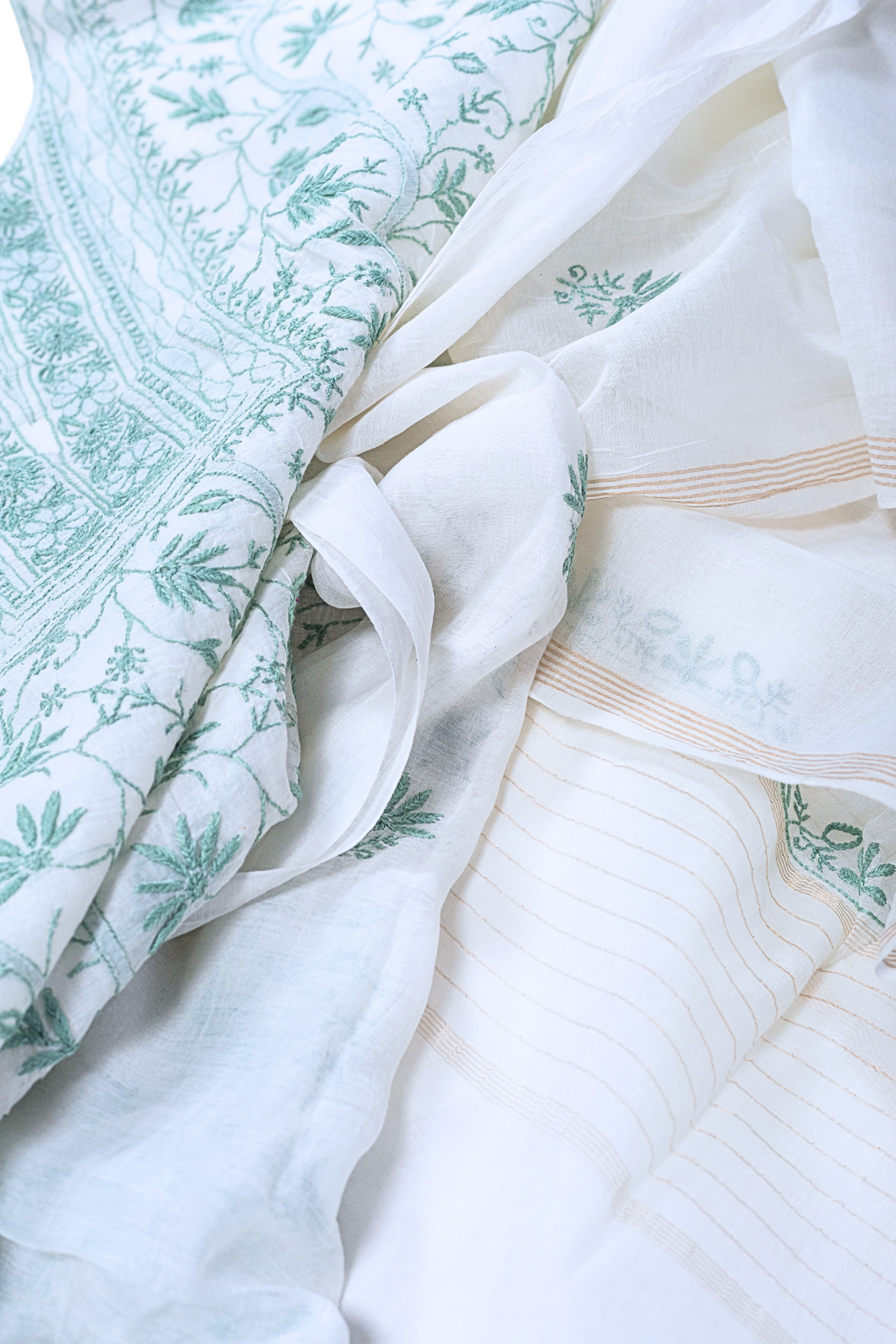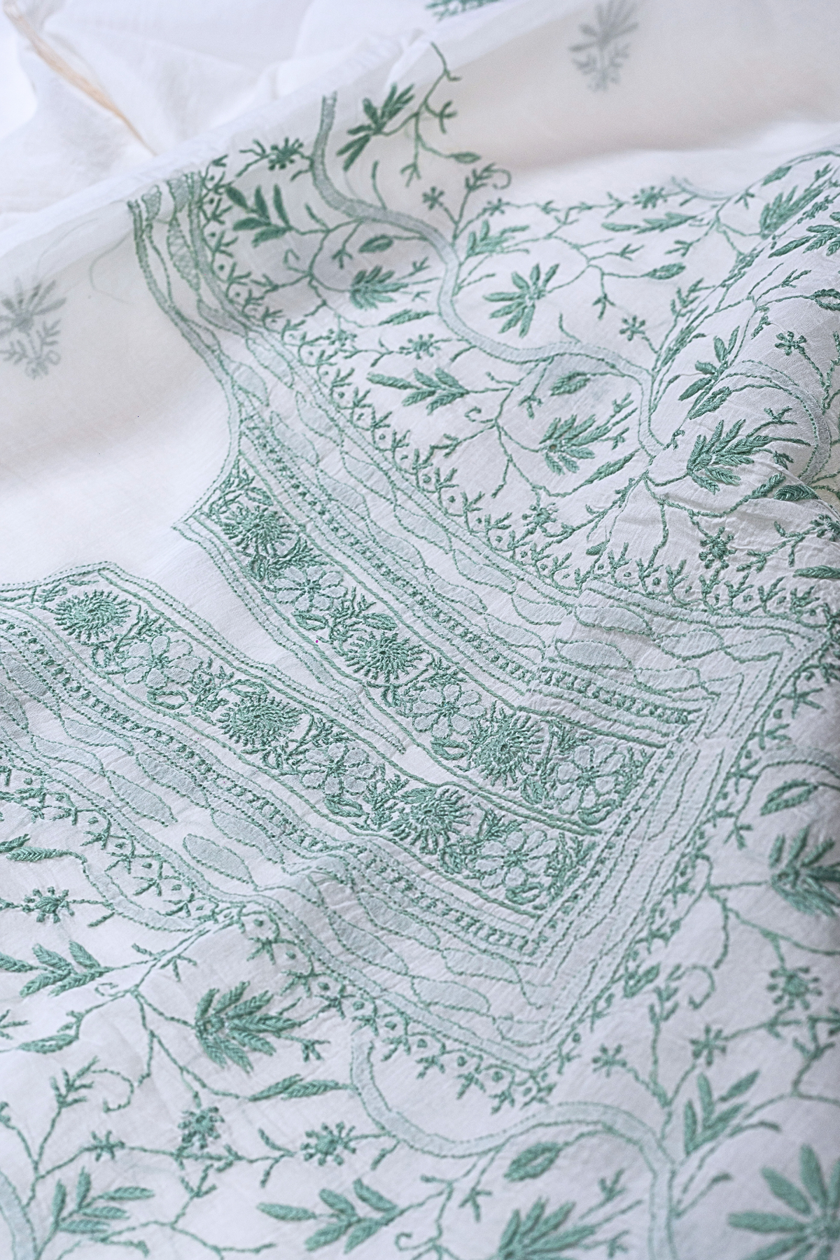 Mul Chanderi Chikankari Suit with Full Jaal Work (3 Piece, Unstitched, Off-White/Green)